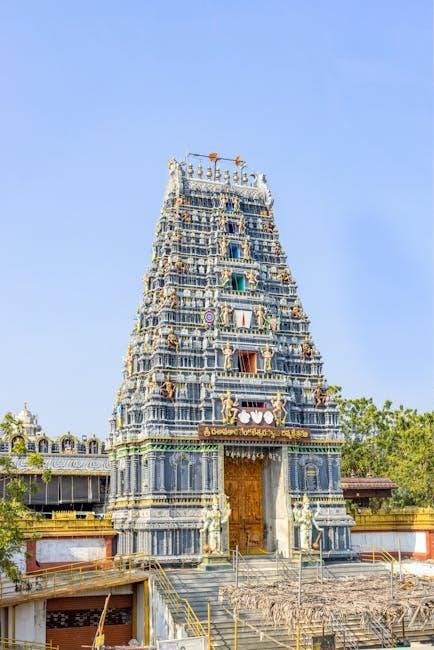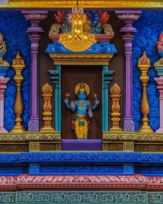 The stotram’s structure mirrors Vedic cosmology, offering a pathway to understand the universe’s divine order through accessible Telugu interpretations and scholarly commentaries.